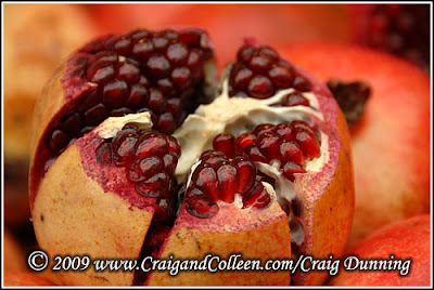 This pomegranate was on display at the market. You can see that it is filled with lots of seeds, which are each inside a red colored juice sack.