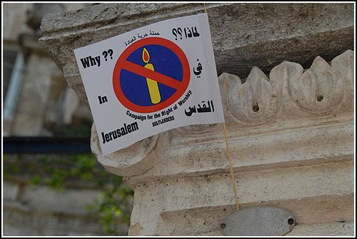 The flag is aimed at the Israeli authority’s efforts to control the crowds, which at times ended up communicating to those wanting to be near or inside the church that they were not allowed to worship. Obviously, once the new arrangements were announced, someone(s) went into action to highlight the Israeli actions and paint them as negatively as possible. However, being in the area today, I must admit, one could easily get a very negative impression without the presence of the flags.