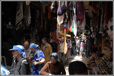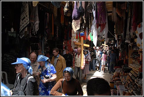 Many Christians from around the world were expected to flood the city for Good Friday, and they did. In fact, since Passover and Eastern and Western Easter falls on the same weekend this year, the city seemed particularly crowded. In expectation of the large crowds the Israeli government implemented new access procedures at the Church of the Holy Sepulchre, which created a lot of tensions. Flags like the one below could be seen throughout the Christian Quarter.